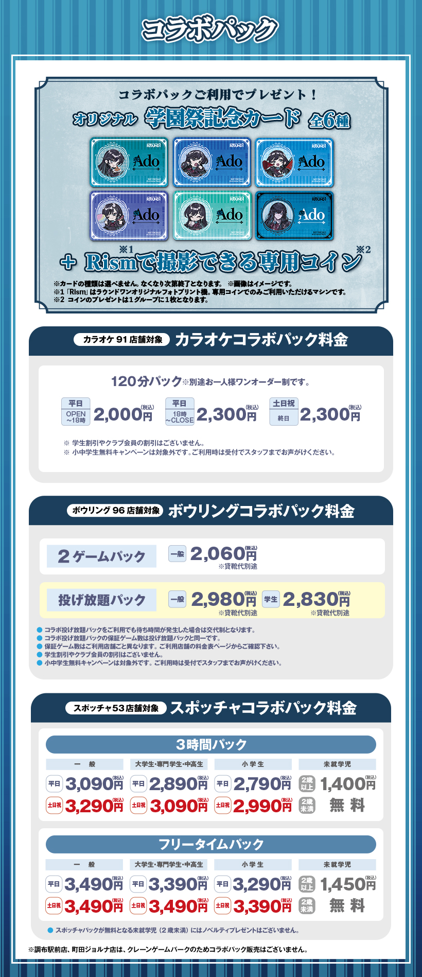 コラボ限定特典が付いたカラオケパック、ボウリングパック、スポッチャパックを販売いたします。