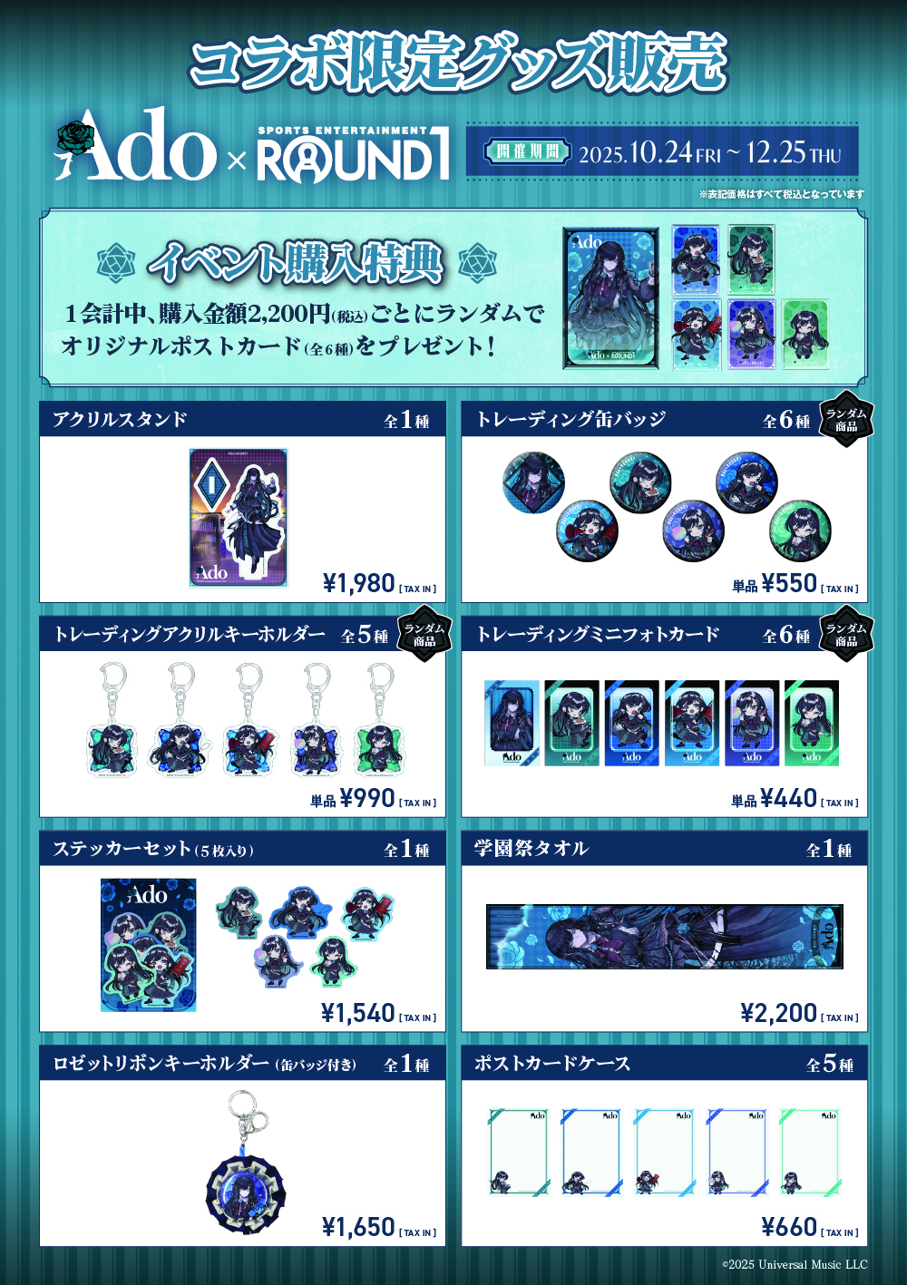 「Ado」コラボグッズを税込2,200円お買い上げごとにポストカード(全6種)をランダムで1枚プレゼント!