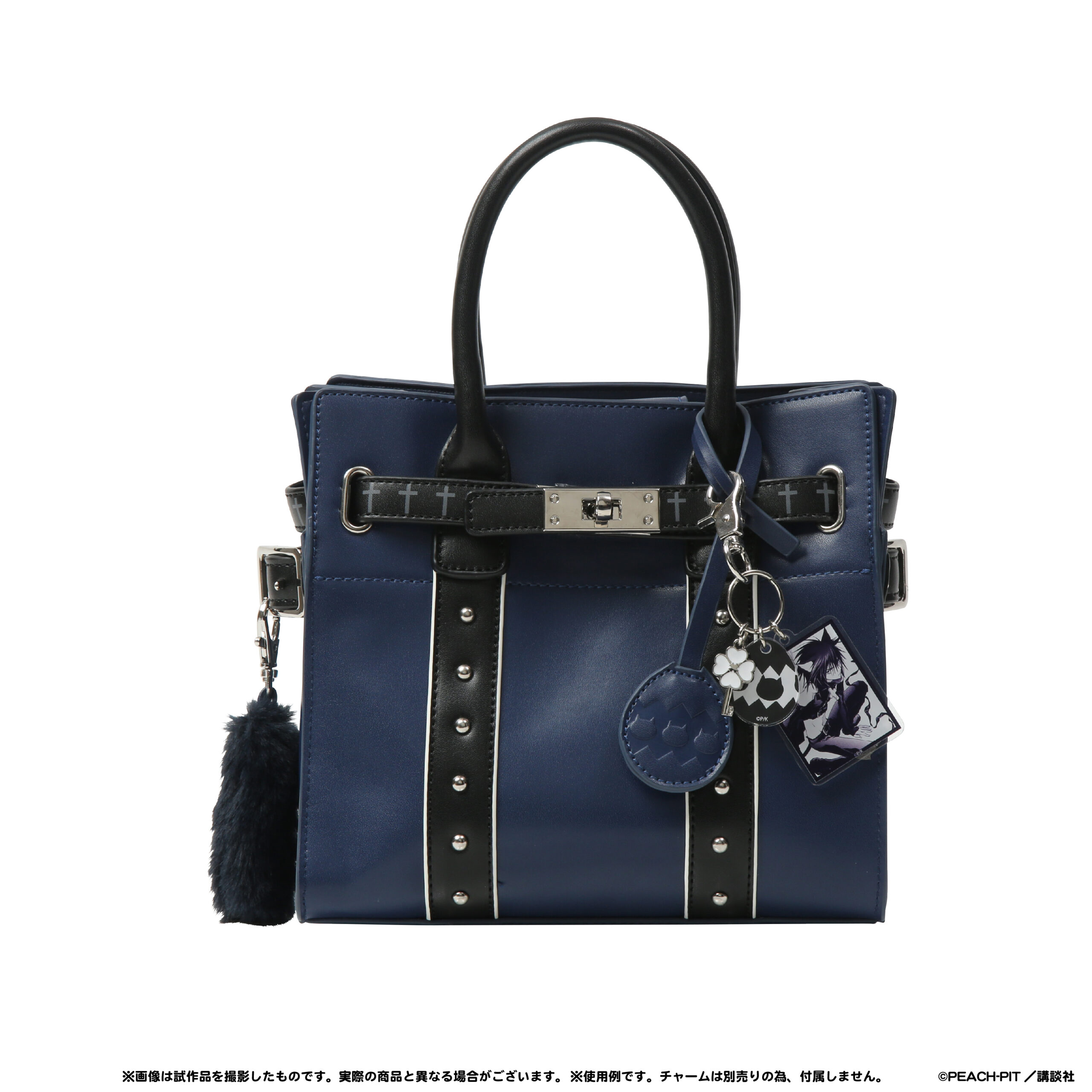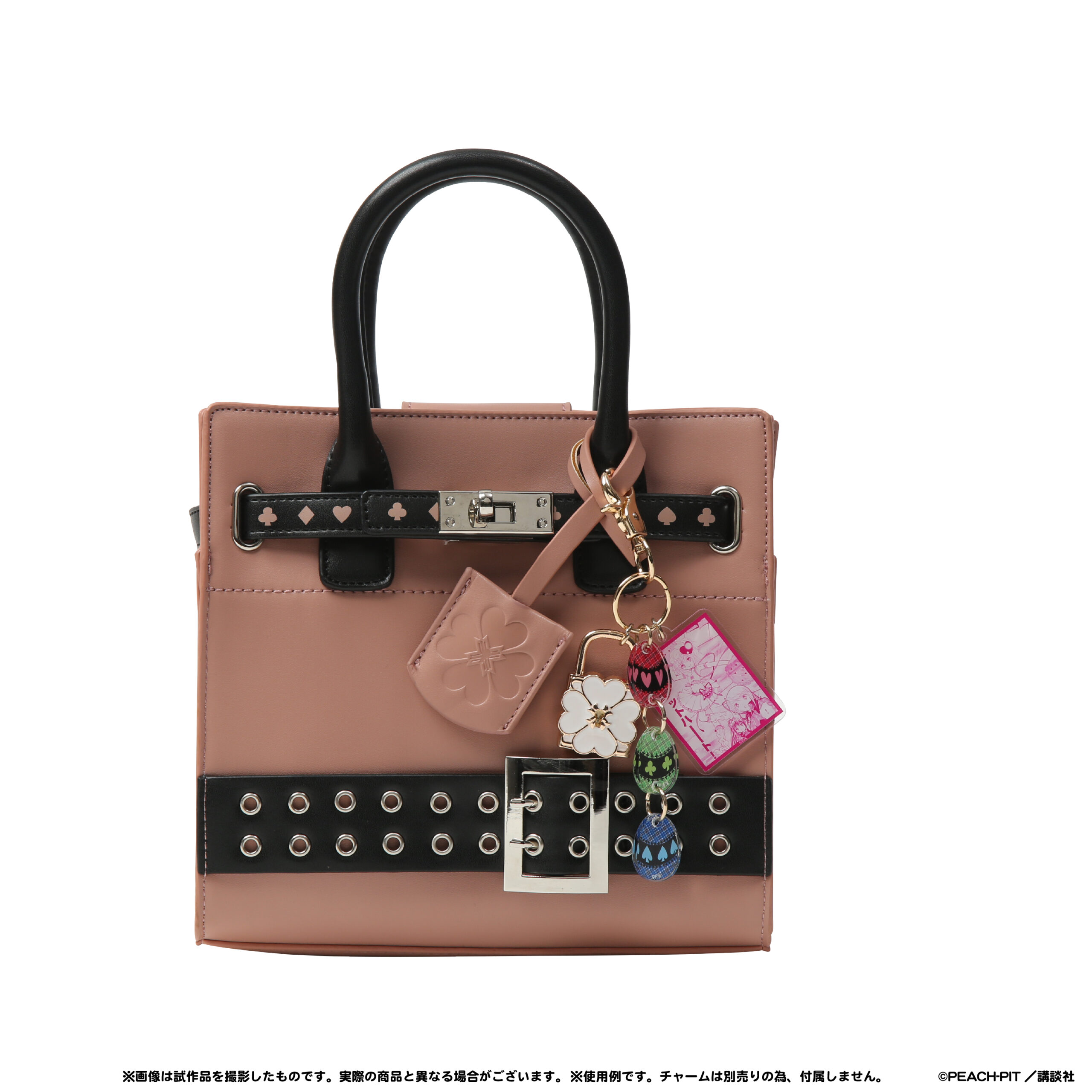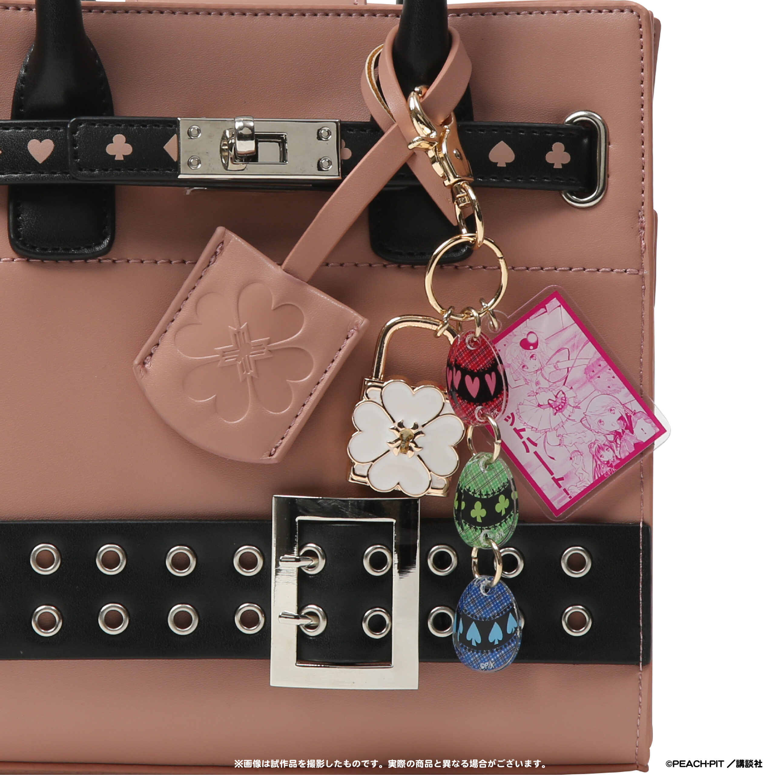 原作コマのアクリルパーツと各キャラをイメージしたモチーフパーツを組み合わせたバッグチャームは、PEACH-PIT先生の美麗イラストが楽しめます。